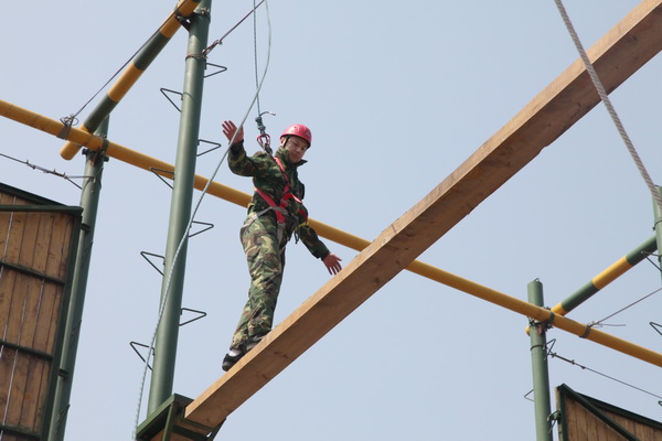 項目簡介:云中漫步又稱獨木橋,這是一個個人心理挑戰(zhàn)項目,學(xué)員在穿好安全裝備的情況下,獨自一人沿著柱子的一端爬至上方的橫木,在規(guī)定時間內(nèi)...