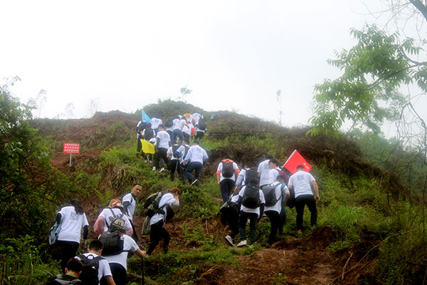 當天下著小雨,徒步上山的小路有些濕滑,隊員們一路堅持不懈、相互幫助,僅用了1.5小時就走完了計劃2.5小時的路程,順利到達山頂大本營。
