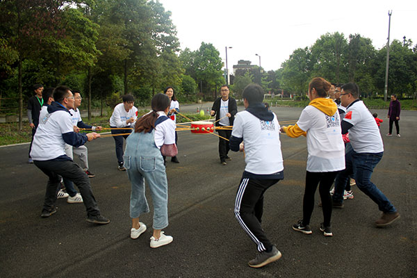 “動力繩圈”跟著音樂的節(jié)拍,眾人劃槳開大船,當隊員在動力繩上走動的時候,大家都奮力的拉緊繩子,承擔責任,相信隊友,這一刻,我把自己托付給你們,完全融入到這個團隊里,感受著同伴的熱情和團隊的力量。