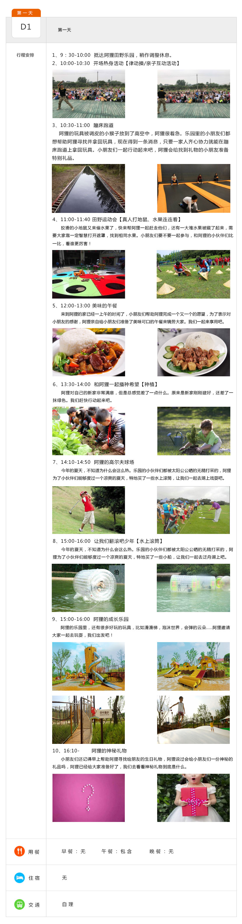 入園門票、親子活動(dòng)組織、游樂項(xiàng)目、午餐、交通接送、戶外活動(dòng)保險(xiǎn)、活動(dòng)橫幅、飲用礦泉水、分隊(duì)服(使用)、后勤拍照、醫(yī)藥等